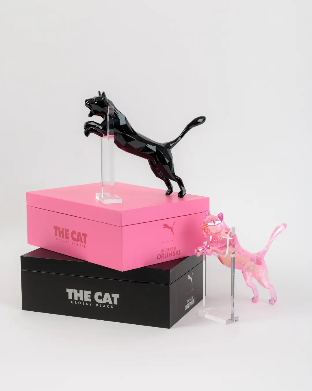 Le logo iconique du félin PUMA est réinterprété en deux éditions saisissantes : une version noire profonde et brillante, incarnant la force et l’intensité, et une version rose galaxie, imprégnée d’une énergie cosmique vibrante.